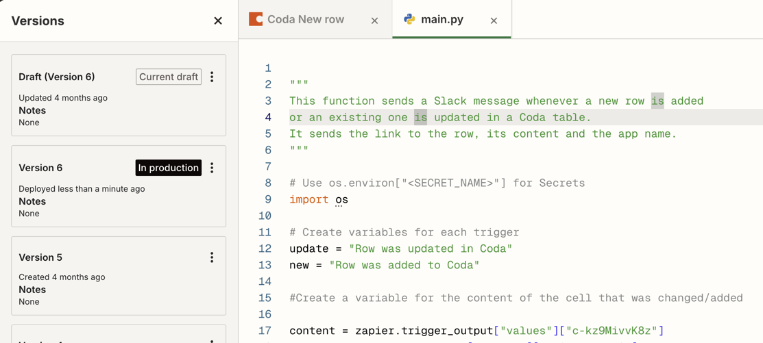 Whenever you make changes to your code in Zapier Functions, you create a new version of the function. You can preview or roll back to a previous version by deploying it.