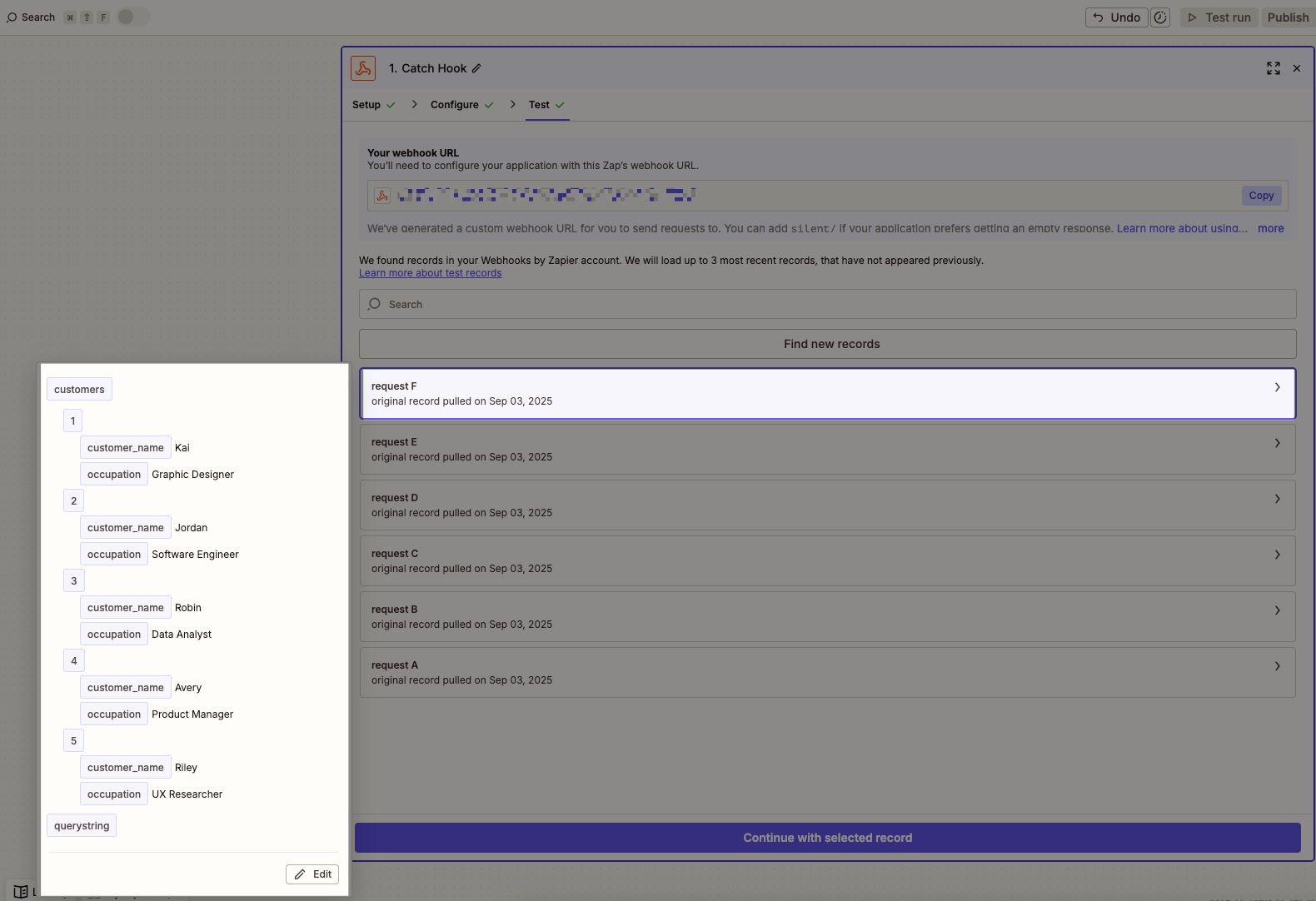 Zapier will run the Zap’s subsequent steps 5 times, once for each person in the array. This will also appear as 5 separate test records in the Zap editor during testing.