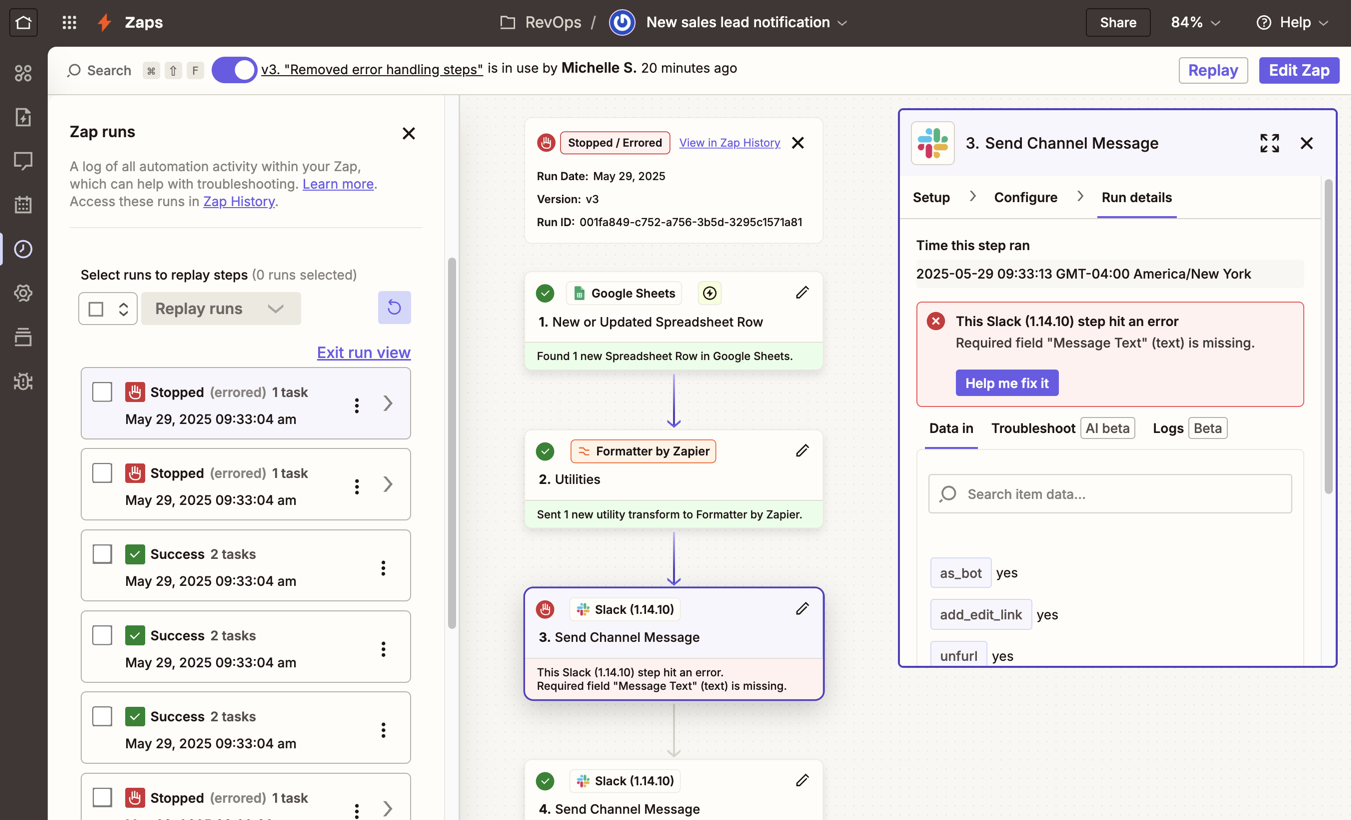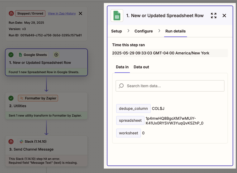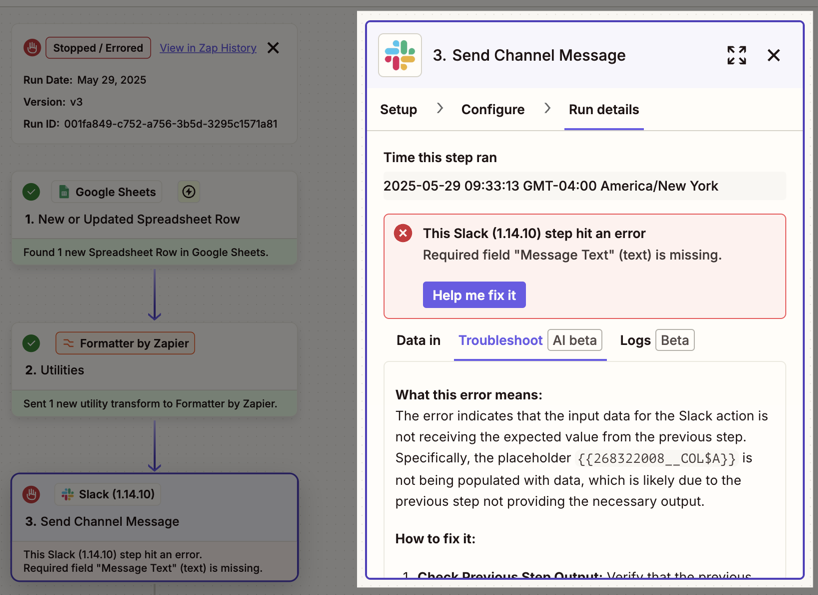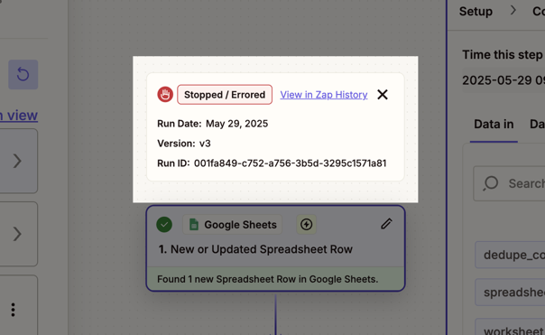 If your Zap errors, reviewing a Zap run can help you pinpoint the problem. Learn how to troubleshoot errors in Zaps.