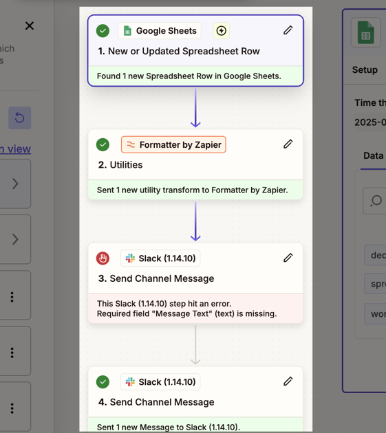 In the left sidebar, click the Zap runs icon to review recent Zap runs. You can select a Zap run card from the list, you will enter the run view. The right sidebar will open and the Zap outline will expand with additional info about the run. Each run will have a Zap run status and each step will have a separate step run status. For example, if the Zap run errors, you may still have individual steps in the Zap run that were successful.