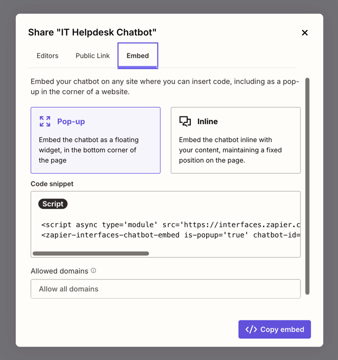 You can share your Zapier Chatbot as a standalone page or embedded on your website. You can also embed a chatbot on Zapier Interfaces.