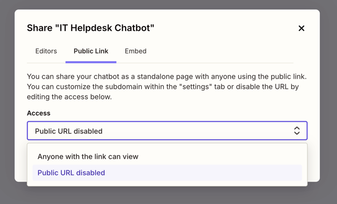 If you only want your chatbot to be available through embedding, you can disable the public URL.