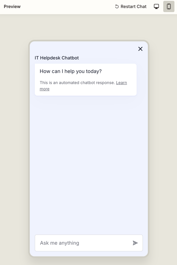 You can preview what your chatbot will look like on desktop and on mobile, before sharing it with your users. The default preview displays how your chatbot appears on desktops. To switch to mobile preview: