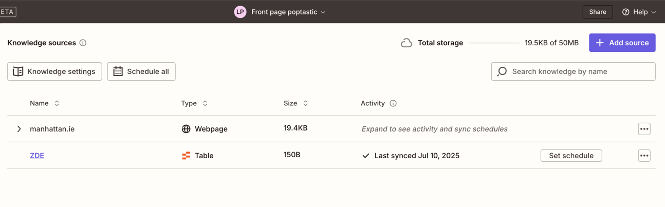 Knowledge sources in Zapier Chatbots can be files, webpages, apps, or tables. The amount of information you can use as a knowledge source depends on your plan and is measured in bytes.
