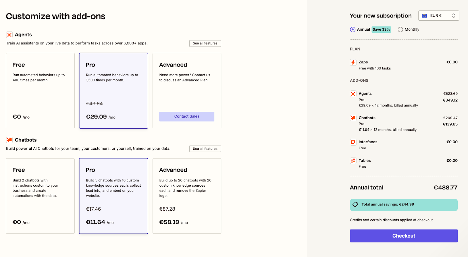 Add-ons are separate subscriptions for Zapier products like Zapier Chatbot and Zapier Agents. You can add them to your account at any time, even without a paid Zapier plan.
